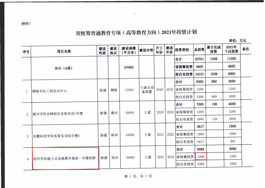 根据我院当前及未来五年办学实际需求,经学院党委研究决定,拟在校区扩建土地上开展嵌入式实践教学基地一号楼组群建设。在完成规划选址、方案设计、节能评估、环境评价及资金筹措方案的基础上,根据《安徽省教育厅关于申报2021年省统筹投资高等教育基本建设专项补助的通知》(皖教秘发【2020】146号),于2020年9月上报了省统筹资金申请材料。经省教育厅和省发改委研究,该项目在申报范围内且符合申报条件。同意给予资金支持。